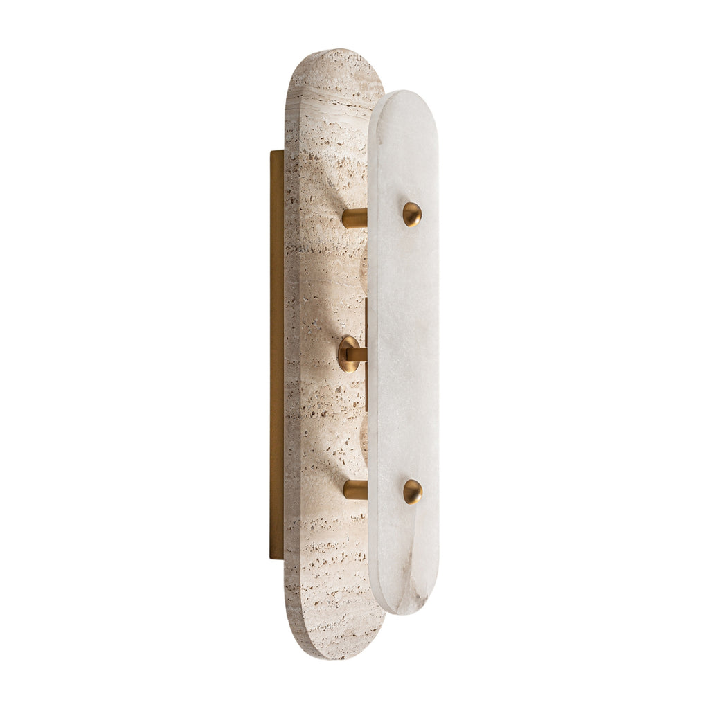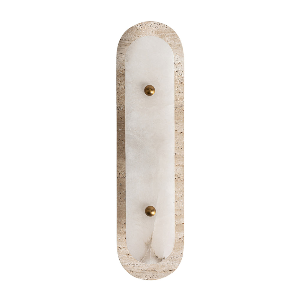 The Tina wall lamp revisits art déco through natural stone. Beige travertine and white alabaster combine with golden details to create a luminous, elegant and deeply decorative piece. Perfect for corridors, bathrooms or spaces seeking a sculptural, sophisticated touch.