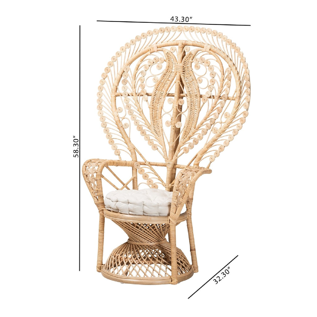 Whimsical yet soothing design transforms the mood of any layout with the outstanding Fedra peacock accent chair. This boho piece is expertly crafted from natural rattan. The grand backrest features curling rattan poles for a stunning yet smooth display while a plush, fabric upholstered seat cushion provides a cozy embrace. The Fedra will arrive fully assembled and features ergonomic armrests for enhanced relaxation. A stunning injection of beauty and comfort perfect for a cozy sun room or patio, the Fedra peacock accent chair bestows an extraordinary quality to any space. Due to the nature of the natural materials used in this product, it may have variations in areas such as, but not limited to, color, pattern, grain and texture. The hair-like strands of rattan/rattan-fiber are common due to nature of the material.