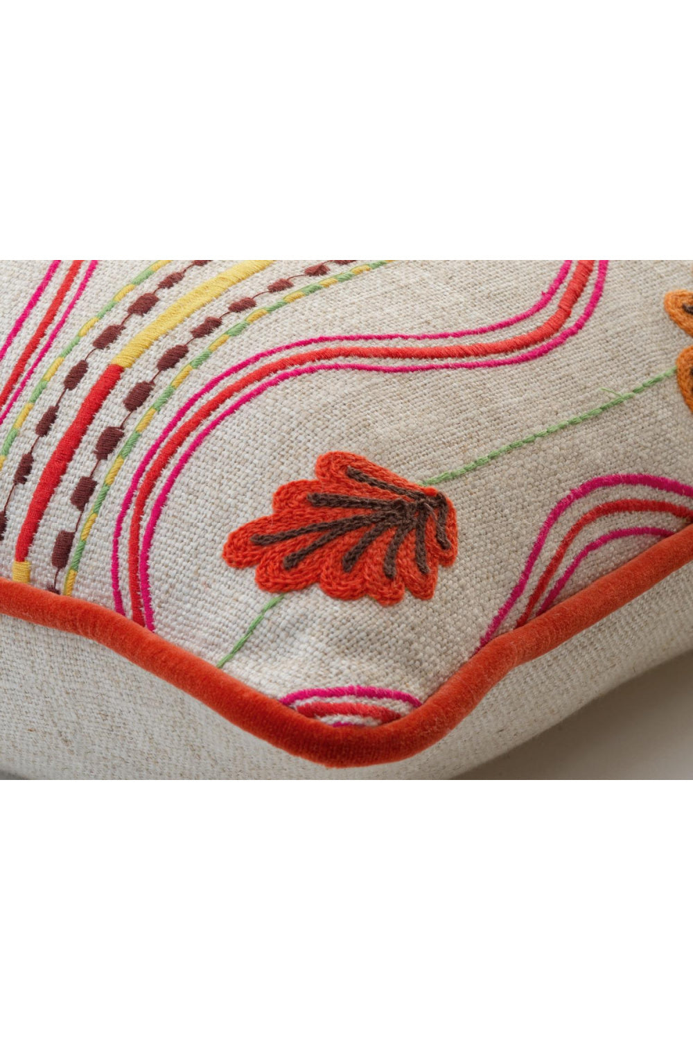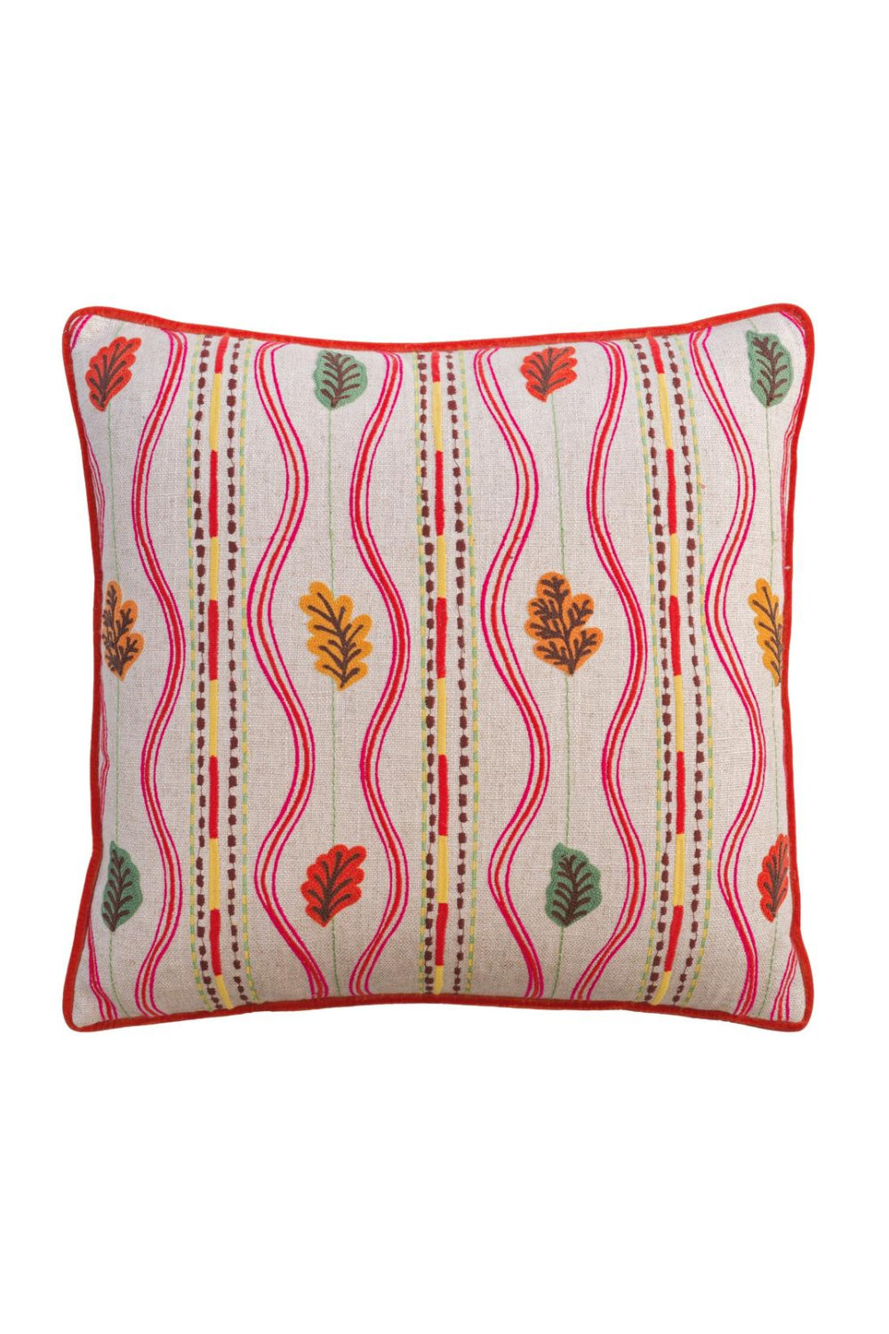 The vibrant Falling Leaves Multi cushion is alive with embroidered oak leaves in fiery reds, golden ochres and fresh greens, all set against a natural flax-hued ground. Undulating stripes give the pattern a sense of movement and rhythm, echoing the whimsical fall of leaves in a breeze.