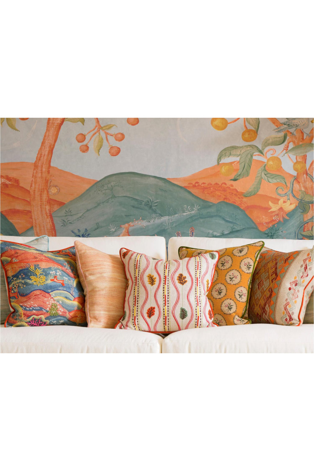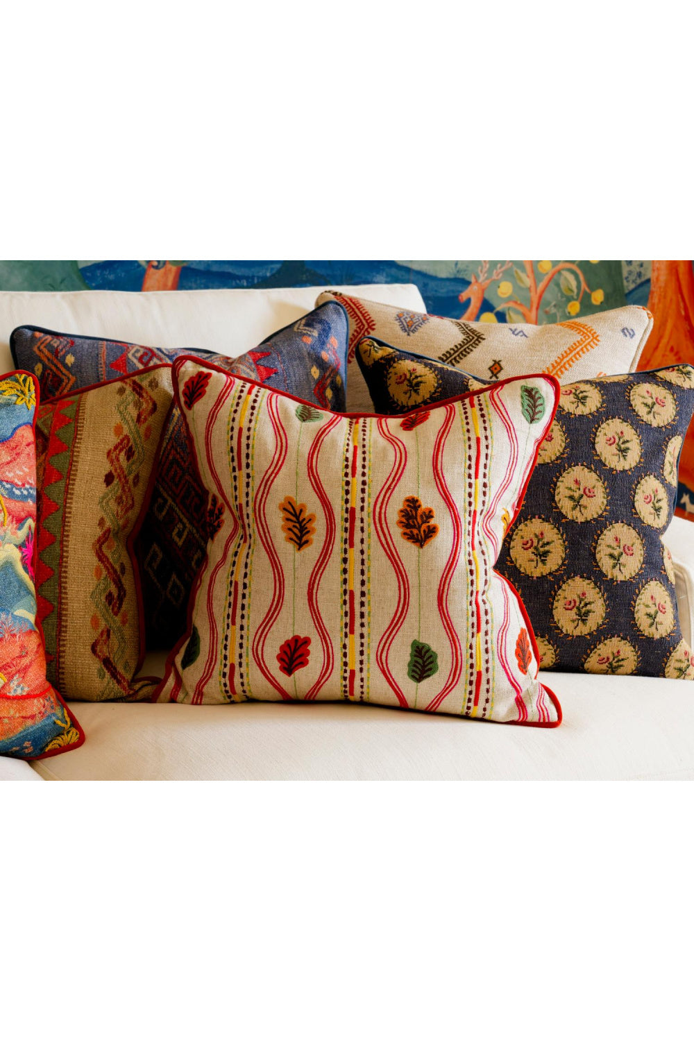 The cushion's lively palette and intricate embroidery make it a standout accent-perfect for layering with plains, checks or other prints.