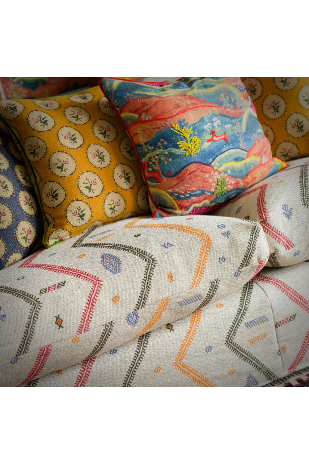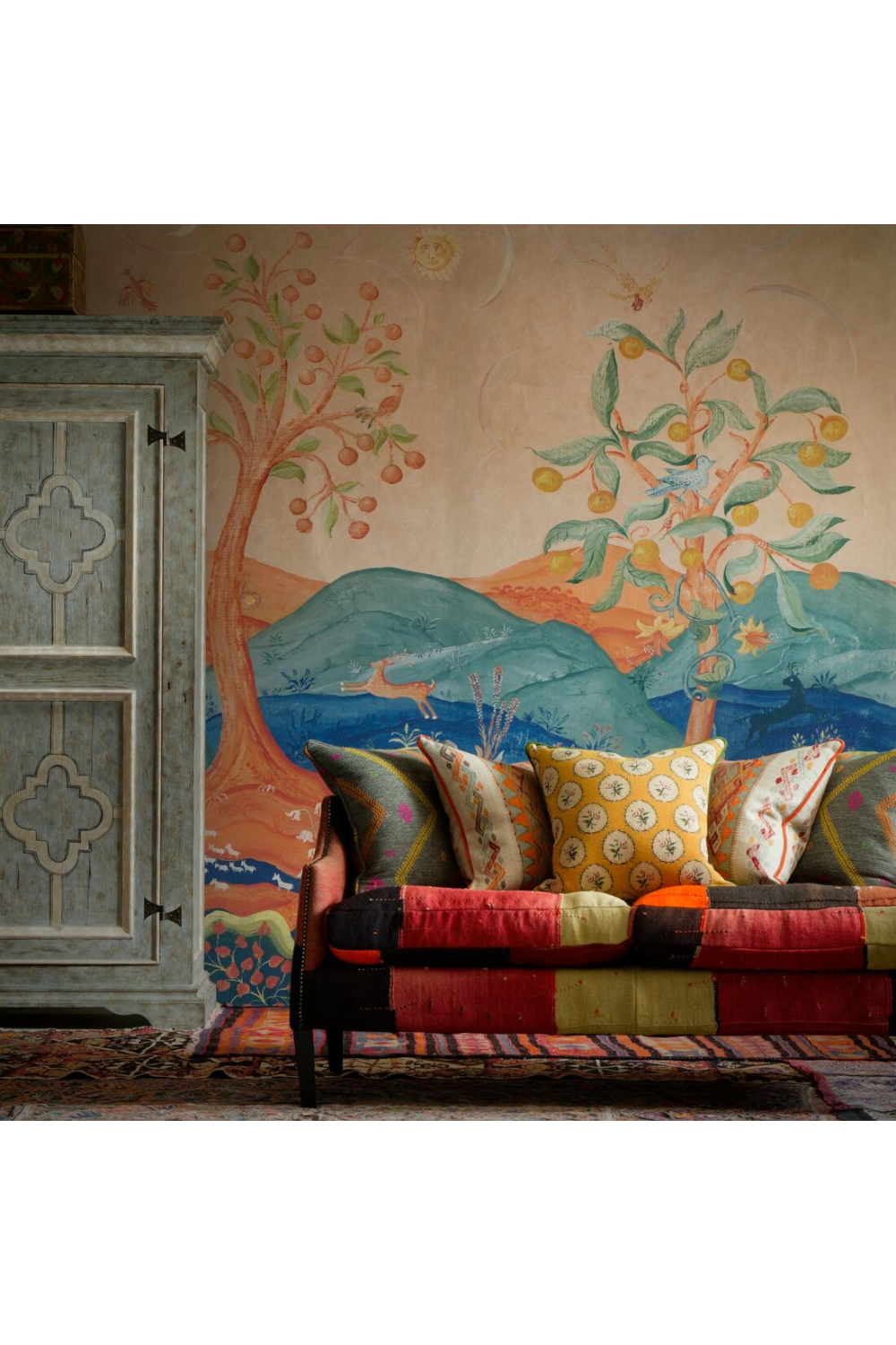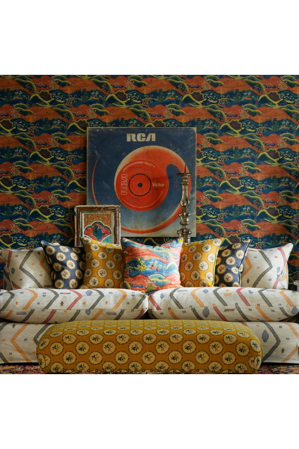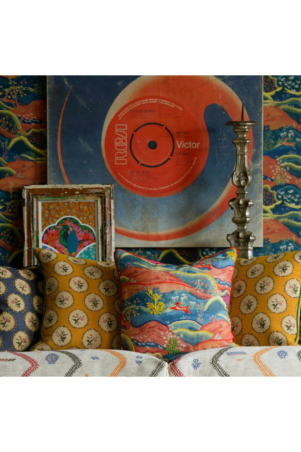 Designed in collaboration with Kit Kemp, Bobbin offers a fresh take on timeless pattern. Its embroidered-style flower medallions bloom across a deep blue ground, framed in soft ochre rings and softened with dusty pink accents. The cushion is paired with complimentary piping in Medici Indigo. The overall effect is both refined and comforting, like a vintage tapestry with a modern sensibility.