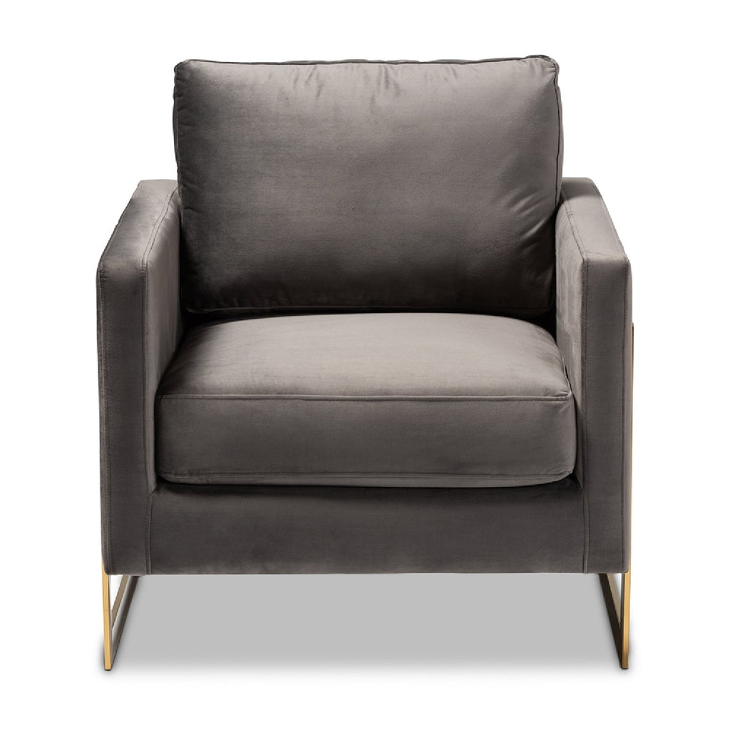 Create an oasis of glamour in your living room with the Matteo armchair. The Matteo features lush velvet fabric upholstery that complements the clean, tailored silhouette. The armchair rests on a stunning gold-tone stainless steel frame, providing an open, airy ambiance. Designed for both style and comfort, the Matteo is generously padded with foam to provide a truly luxurious feel.