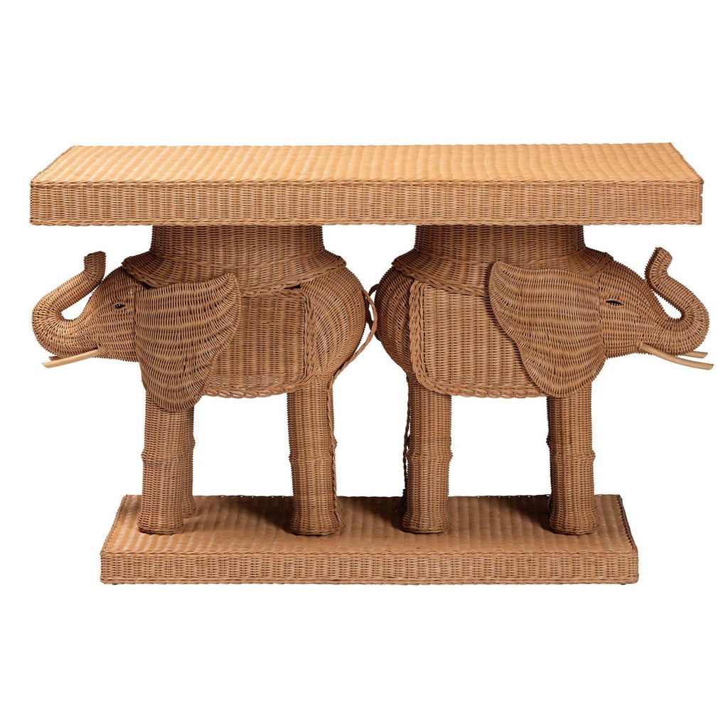 Anchor your space with impressive display of rustic craftsmanship that is the Elissa console table. This bohemian piece consists of a sturdy teak wood frame adeptly embellished with natural rattan by remarkably skilled artisans. Columns shaped in the visage of distinguished elephants provide excellent support while showcasing the artistic potential of rattan. The Elissa will arrive fully assembled and features a rectangular tabletop that serves as a robust and versatile centerpiece. Crafted with impeccable technique, the Elissa console table brings a serene aura to any interior. Disclaimer: Rattan is a product of nature and may have variations in areas such as, but not limited to, color, pattern, grain and texture. The hair-like strands of rattan/rattan-fiber are common due to the nature of the material.