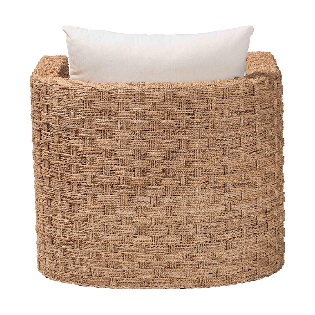 Embrace the relaxing nature of rustic design with the stunning Rhinos arm chair. Made in Indonesia, this bohemian piece consists of a sturdy wood frame embellished in woven seagrass. Its back curves for a delightful twist on the classic tuxedo silhouette that showcases the geometrically woven seagrass exterior from every angle. The Rhinos will arrive fully assembled and is fitted with removable cushions padded with plush foam and upholstered in sumptuous fabric. Smooth armrests encourage relaxation, making the Rhinos arm chair a soothing addition.