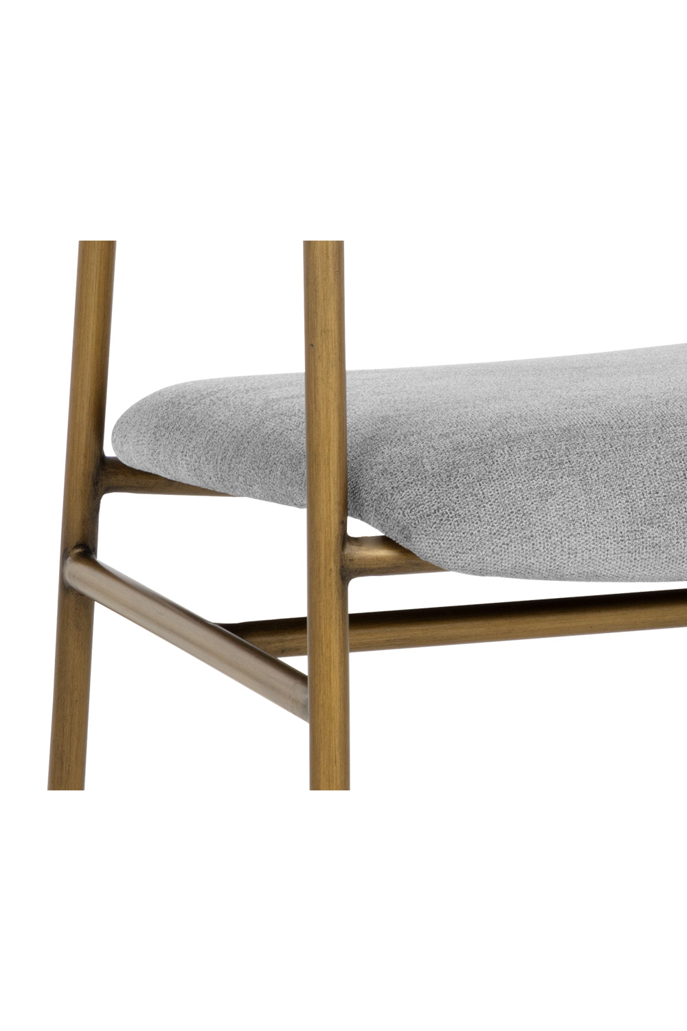 Taking inspiration from mid-century design, this dining armchair is infused with modern elements that result in a beautiful and simple style. Features a smoke gray rubberwood seatback and an upholstered polo club stone performance fabric cushion. Completed with steels legs in an antique brass finish. Performance fabric is moisture repellent, durable and easy to clean. Suitable for various dining, kitchen and bar spaces of all sizes.