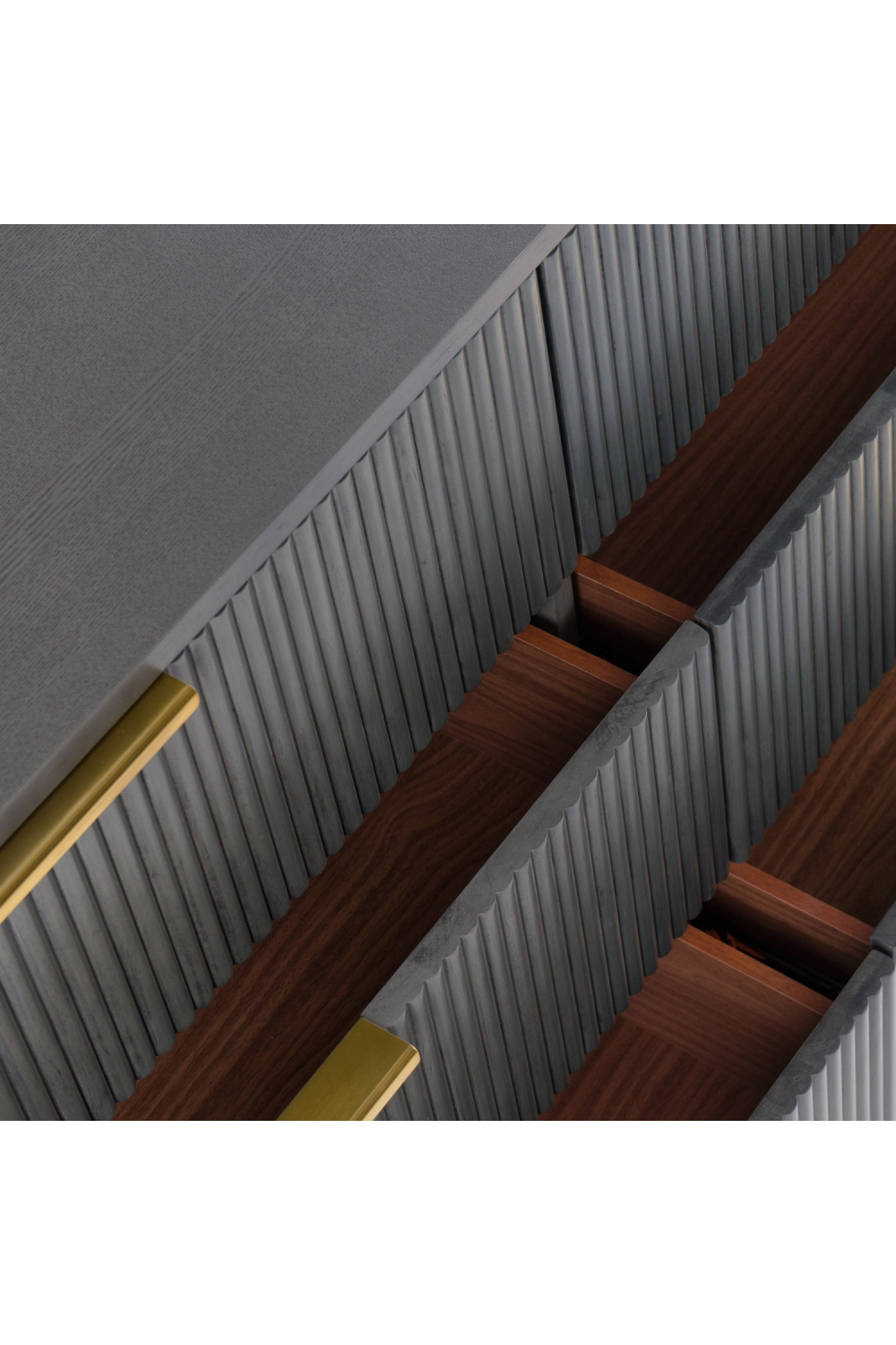 The Nova Domus Santa Monica Dresser showcases a modern aesthetic with a sleek grey wash finish. Its design features vertical lines that add texture and depth, complemented by elegant gold accents on the handles. The dresser offers ample storage with six spacious drawers, making it both functional and stylish. This piece seamlessly blends contemporary chic with minimalist elegance, perfect for enhancing any bedroom environment.