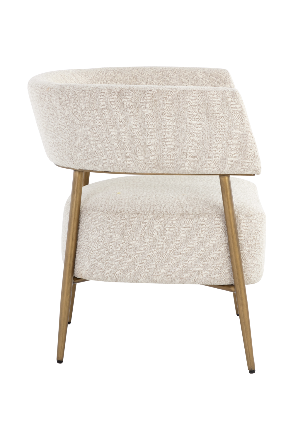 Turn heads with this contemporary lounge chair that exudes extravagance. Features a curved frame and upholstered in our dove cream fabric. Completed with antique brass legs. Also available in danny navy and rust fabrics.