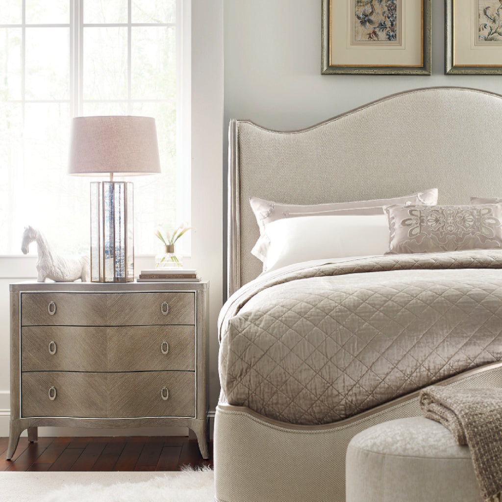 This graceful nightstand pairs beautifully with the bed in this collection. Quartered Ash veneer has been inlaid in a chevron pattern and finished in Elegant Linen to create a large three-drawer piece that’s the perfect height. The drawers open with custom contemporary oval metal pulls to reveal a glistening Pearl finish inside. Contemporary tapered feet complete the attractiveness of this serpentine-shaped piece.