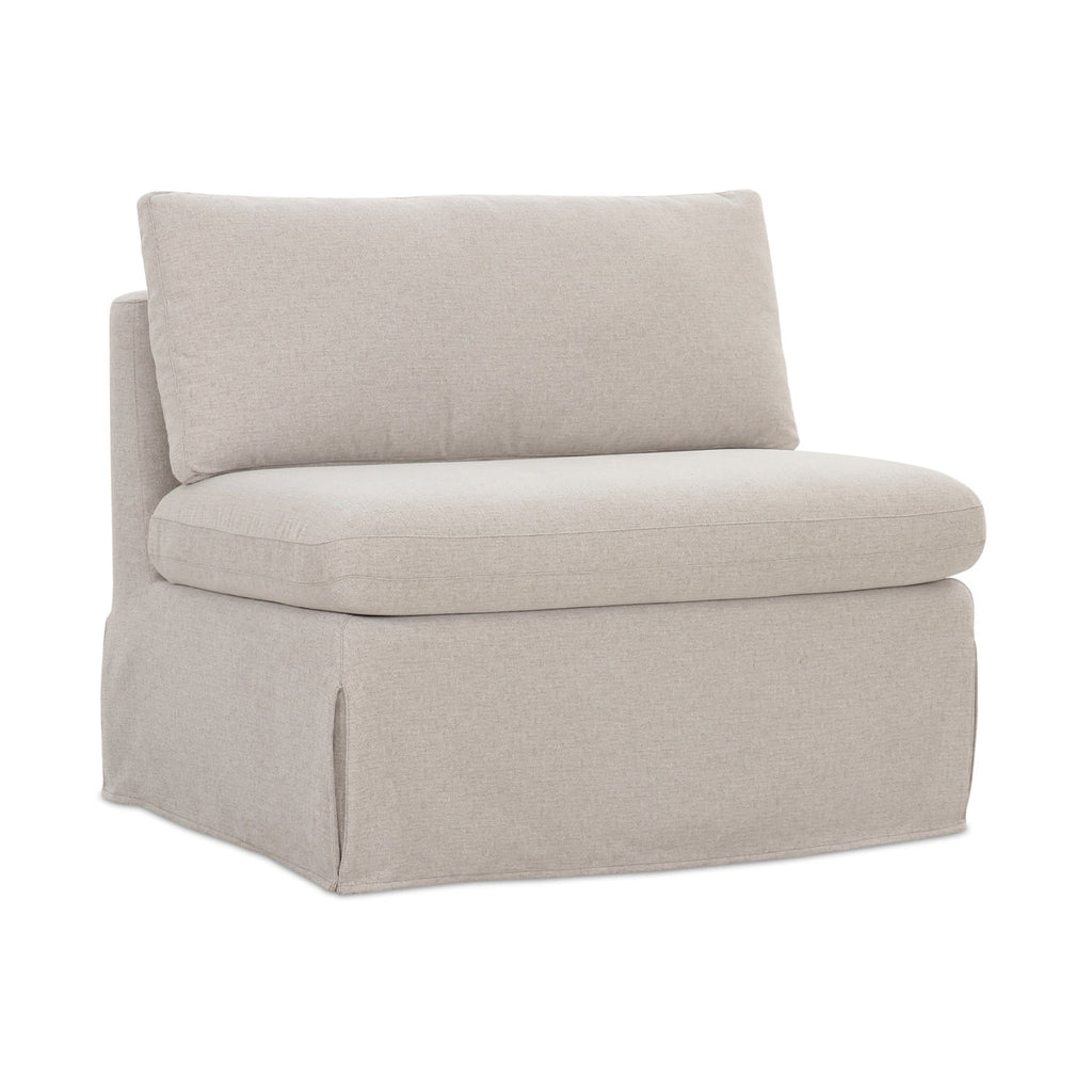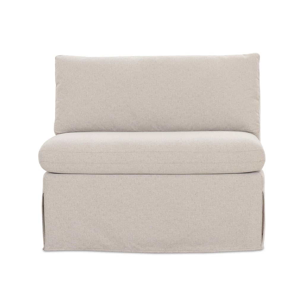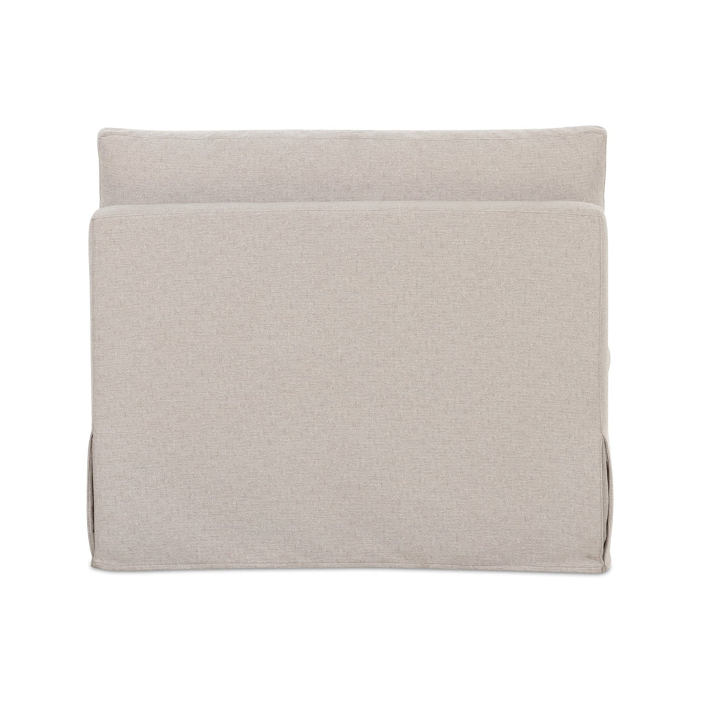 The Fable slipcover dining chair and a half's snug-fitting, washable slipcover with inverted pleats offers a tidy appearance and effortless upkeep. A slight tilt encourages a relaxed seating posture with a pillow back and seat cushions for comfort. Designed to be modular, it includes alligator clips to connect with other pieces in the collection, adapting seamlessly to various dining table sizes.