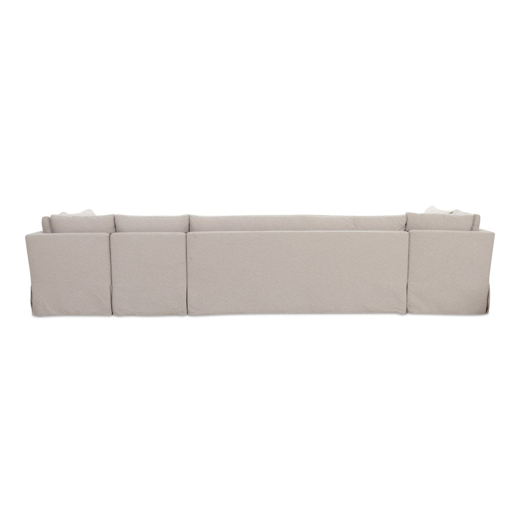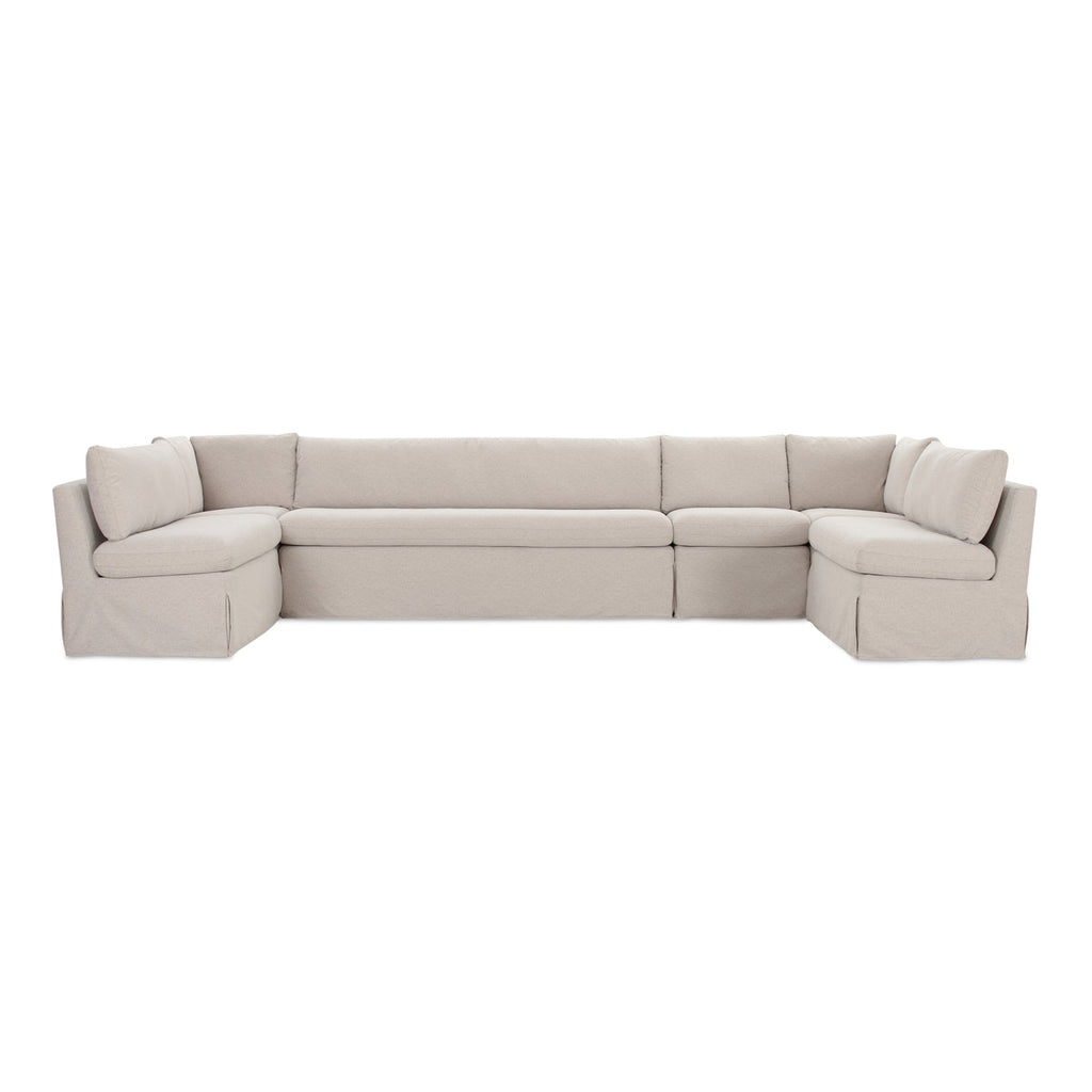 The Fable slipcover dining banquette U-shape's snug-fitting, washable slipcover with inverted pleats offers a tidy appearance and effortless upkeep. A slight tilt encourages a relaxed seating posture with a pillow back and seat cushions for comfort. Designed to be modular, it includes alligator clips to connect with other pieces in the collection, adapting seamlessly to various dining table sizes.