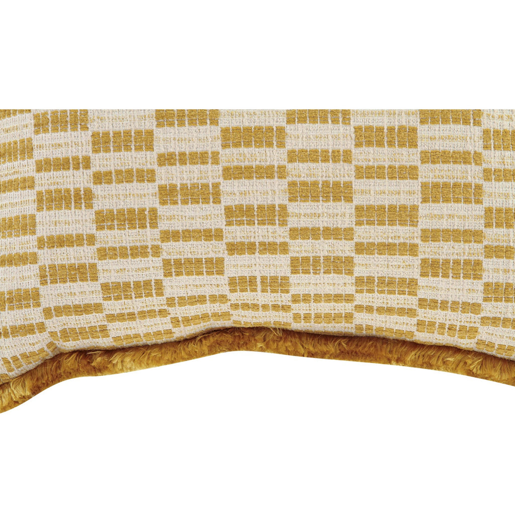 The Leone cushion adds vintage charm and contemporary flair with its bold geometric print in vibrant chartreuse. Meticulously crafted with a dense fringe trim, this Art Deco-inspired accent piece offers comfort and enduring character.