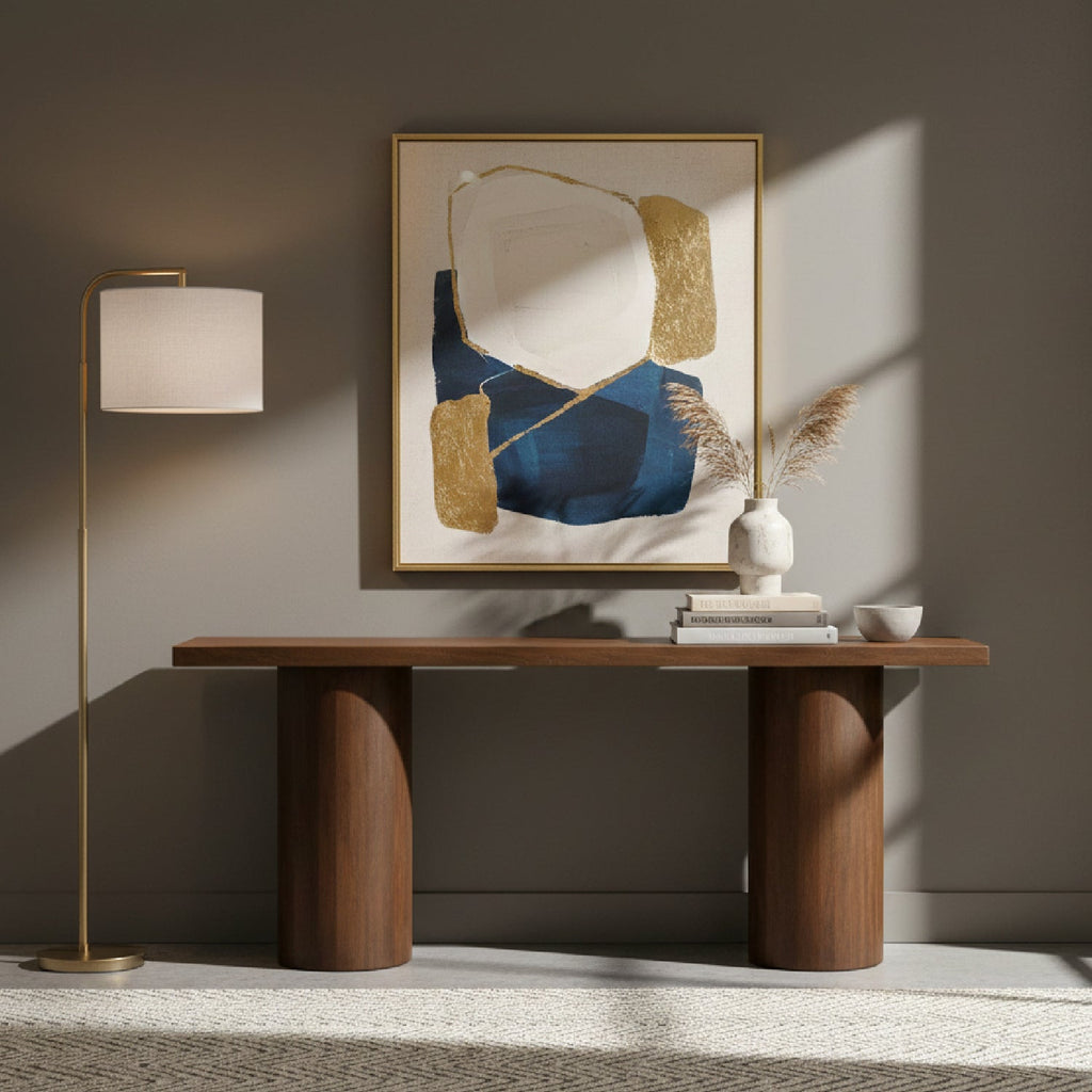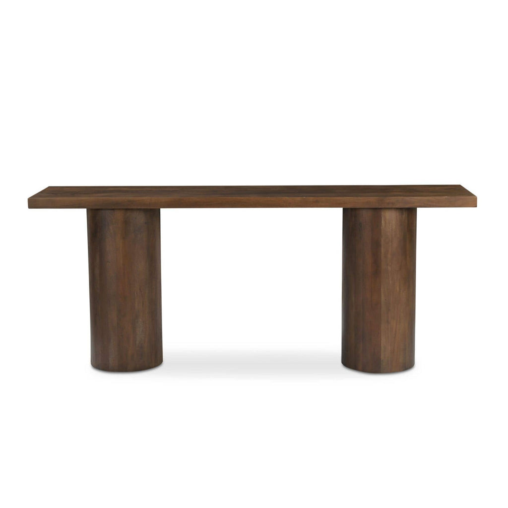 The Hadley console table showcases the natural beauty of reclaimed neem wood with understated elegance. Its minimalist design features a substantial 2-inch-thick rectangular top resting on robust cylindrical bases. Each piece tells a unique story through subtle variations, a testament to the wood's previous life.