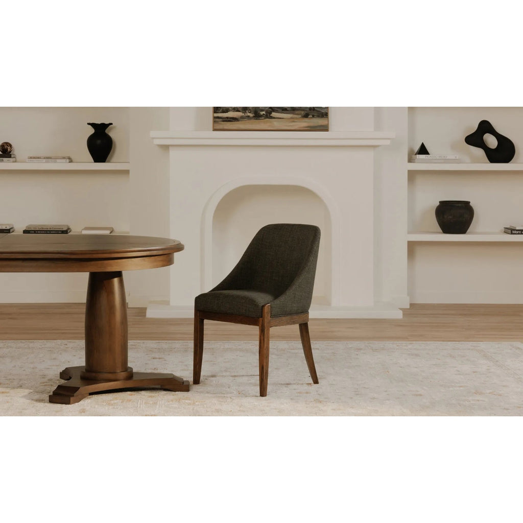 The Edward dining chair is an ideal balance of comfort and sophistication, featuring a traditional silhouette with a generously padded seat and curved backrest. Crafted from expressive solid oak in a dark espresso finish for a rustic touch and upholstered in easy-to-clean, stain-resistant performance fabric, this versatile piece seamlessly combines an enduring style with everyday livability.