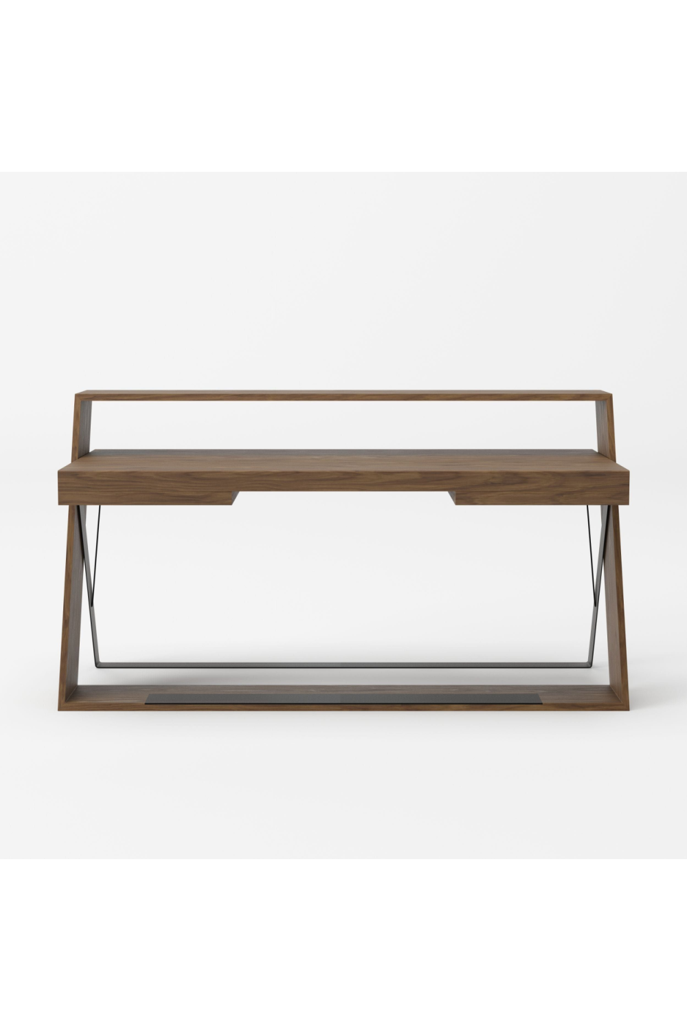 The Carrie desk has an interesting geometric design with crisscrossing legs and two soft-closing drawers. With an American walnut veneer tabletop and leg and another black metal base leg, this desk is certainly a conversation piece for any modern office.