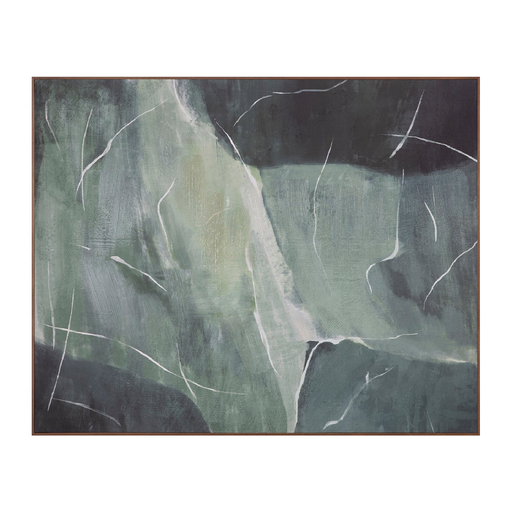 Impression uses a soft blend of tonal shades to convey ease. Bright white brush strokes add dimension and a subtle mystery. This large-scale piece is finished in a warm pine wood frame for an heirloom appeal.