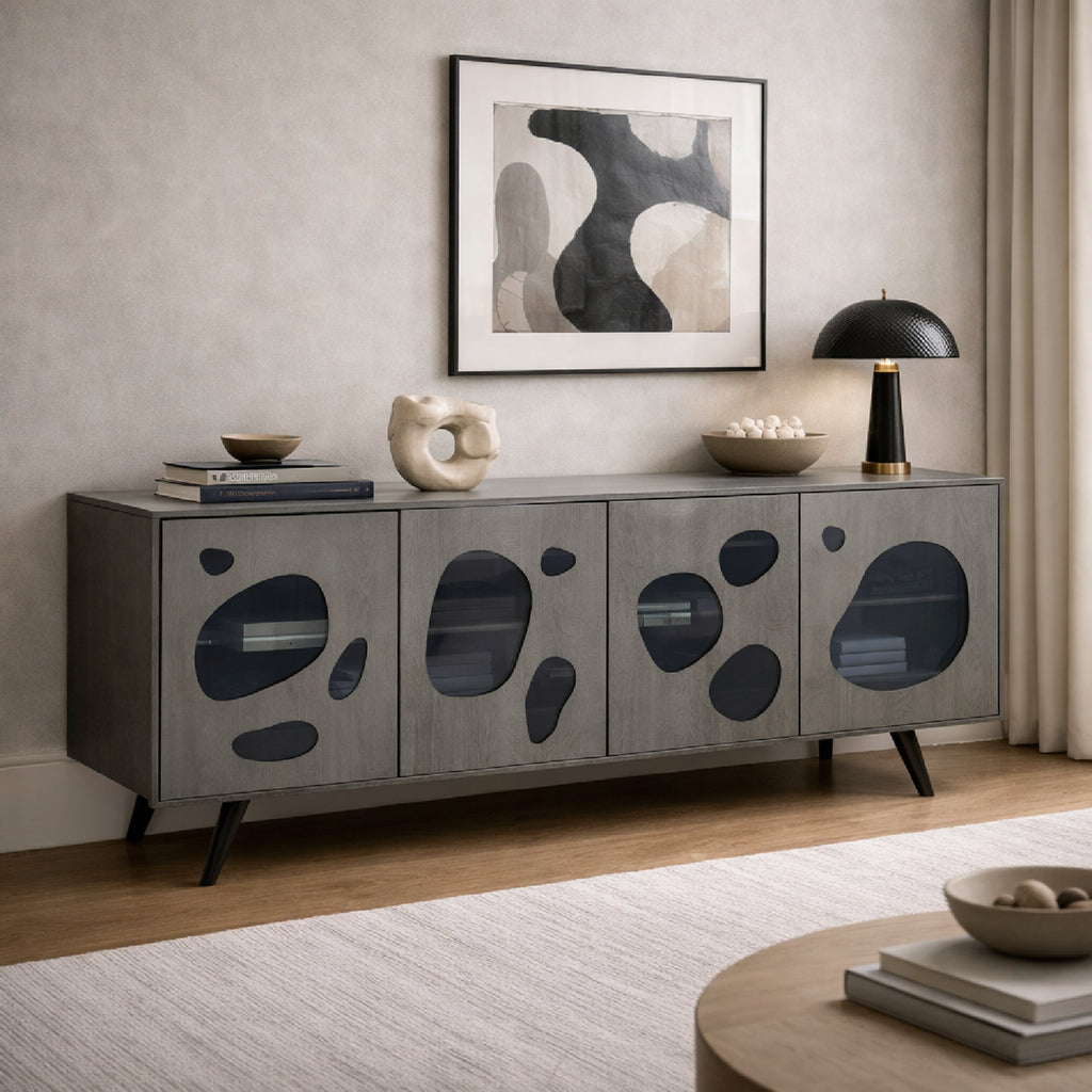 The Fontana Buffet is a unique marvel of modern design. Finished in a matte grey walnut veneer, the faces of the buffet are broken up by sporadic amoebas shapes that seem to dance on its surface. Four magnetic doors open to a gorgeous glass shelf with a lit panel. This gorgeous buffet is bursting with features that all converge to create the perfect conversation piece in your home.