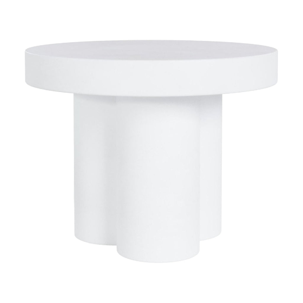 The Modrest Bruni Modern White Concrete End Table exudes contemporary elegance with its sleek, minimalist design. Featuring a smooth, round top, the table rests on a unique base made of three cylindrical legs, creating a sculptural silhouette. The solid white concrete finish adds a touch of sophistication, making it a perfect accent for modern living spaces. This versatile end table harmonizes with various decor styles while providing a chic surface for decorative items or beverages. With its striking form and durable material, it is both functional and aesthetically pleasing.