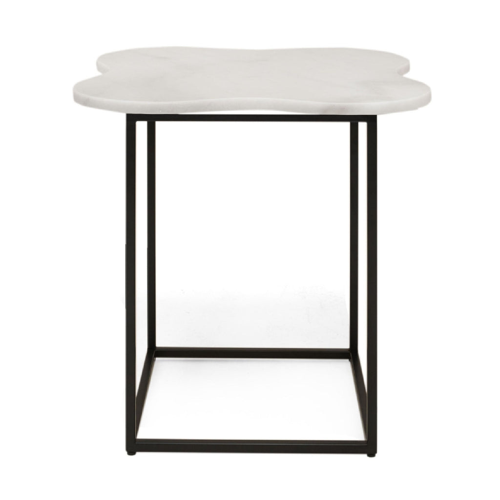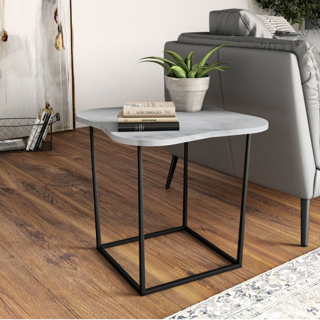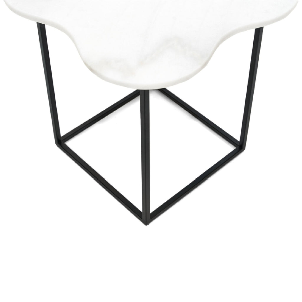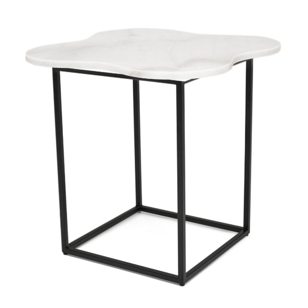 The amoebas white stone top of the Aleidy End Table rests upon a stylish black metal frame. This square tube frame is sturdy and stylish. The hard finish of the frame against the soft stone creates a beautiful juxtaposition of contemporary and industrial styles.