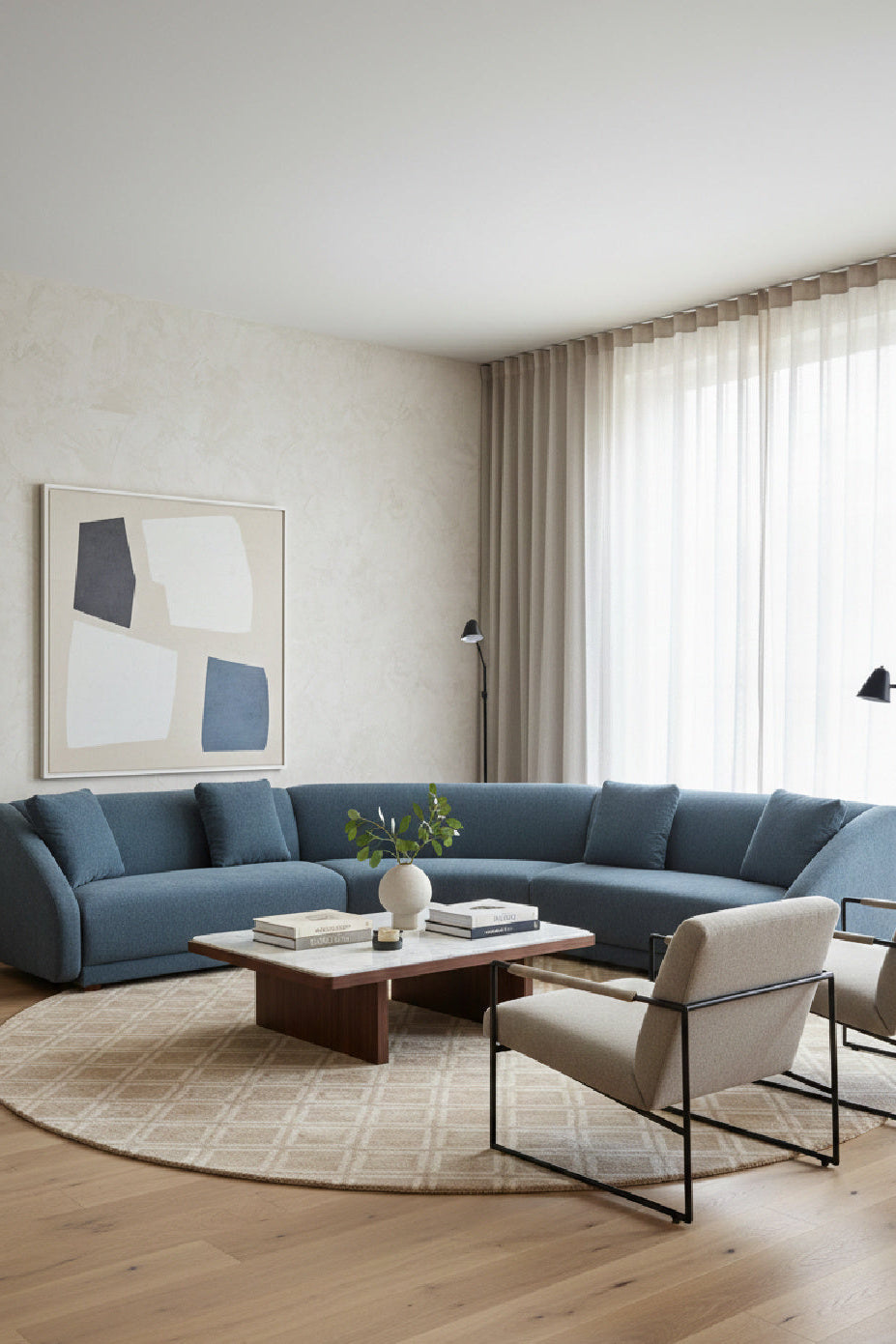 The Fraser sectional’s contemporary modular design infuses the elegance of gentle slopes with linear precision, harmoniously merging soft curves and angular forms into its 60s and 70s-inspired aesthetic. Crafted on a minimalist plinth base and upholstered in sumptuous 100% polyester, foam and fiber seating invites serene repose.