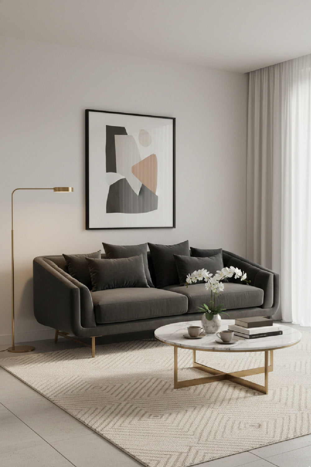 A beautiful sofa that exudes luxurious mid-century modern style. Designed with channel tufting on the seatback in shadow grey fabric or polo club muslin performance fabric and finished with antique brass metal feet. Comes with 6 cushions for added comfort.