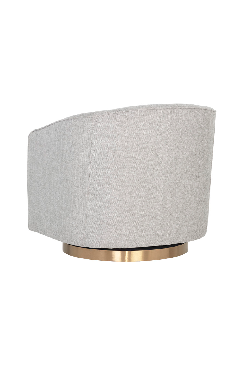 A stylish and comfortable swivel chair perfect for living, lounge and office spaces. Features a barrel back design upholstered in fabric. A brushed antique brass round base with 360 degree swivel completes the design.