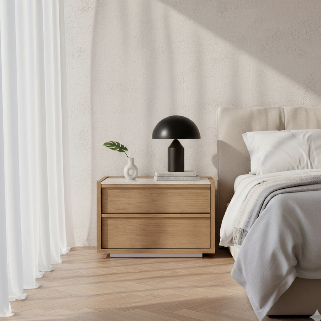 The perfect bedroom companion. A light rosa marble tabletop lies firmly over solid oak frame and oak veneer drawers. Its two soft-close compartments provide ample space for bedside needs.